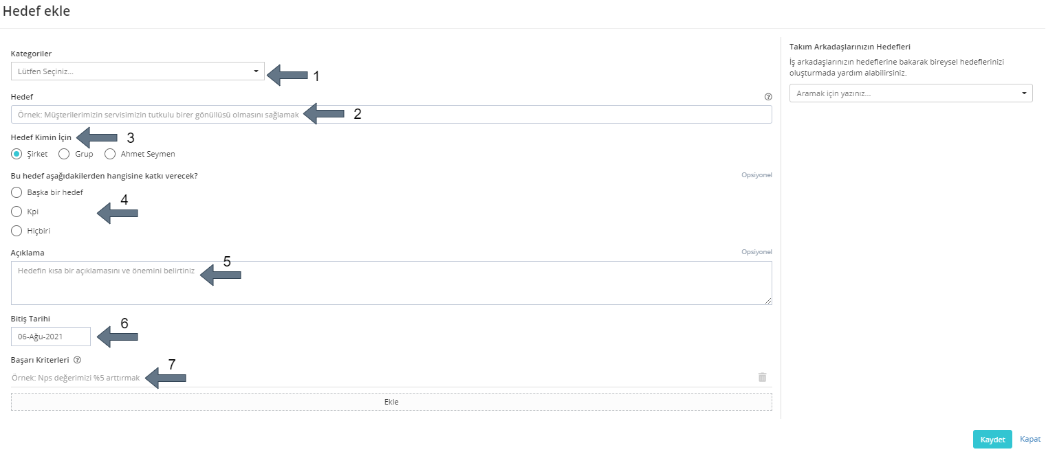 Belirlediğiniz hedeflerin başarı kriterlerini buradan oluşturabilirsiniz.