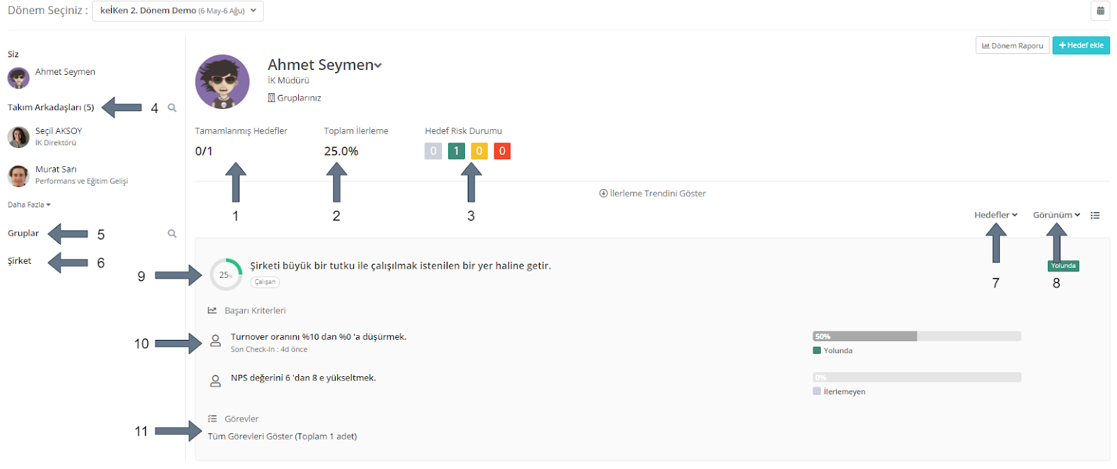 Bu bölümden tarafına veya diğerlerine atanmış hedefleri, görevleri ve başarı kriterlerini ayrı ayrı görüntüleyebilirsin.