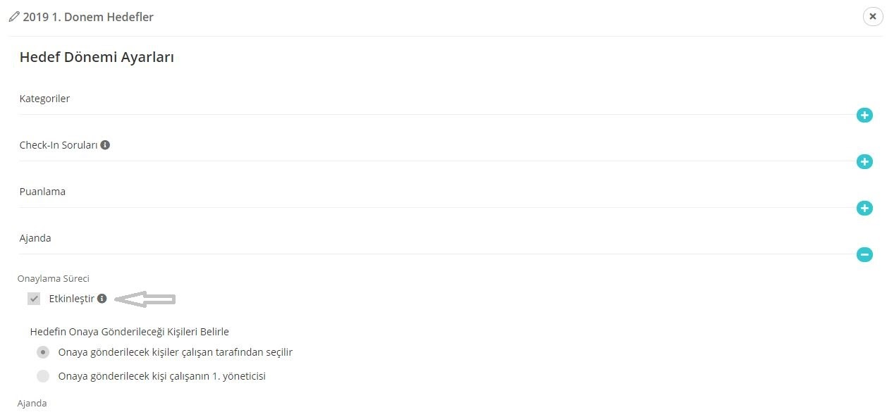 İş hedeflerin için onay mekanizması kullanmak isteyebilirsin. Bunun için iş hedefi dönem ayarlarında yer alan ajanda bölümündeki onaylama süreci kutucuğunu etkinleştirmen gerekiyor.