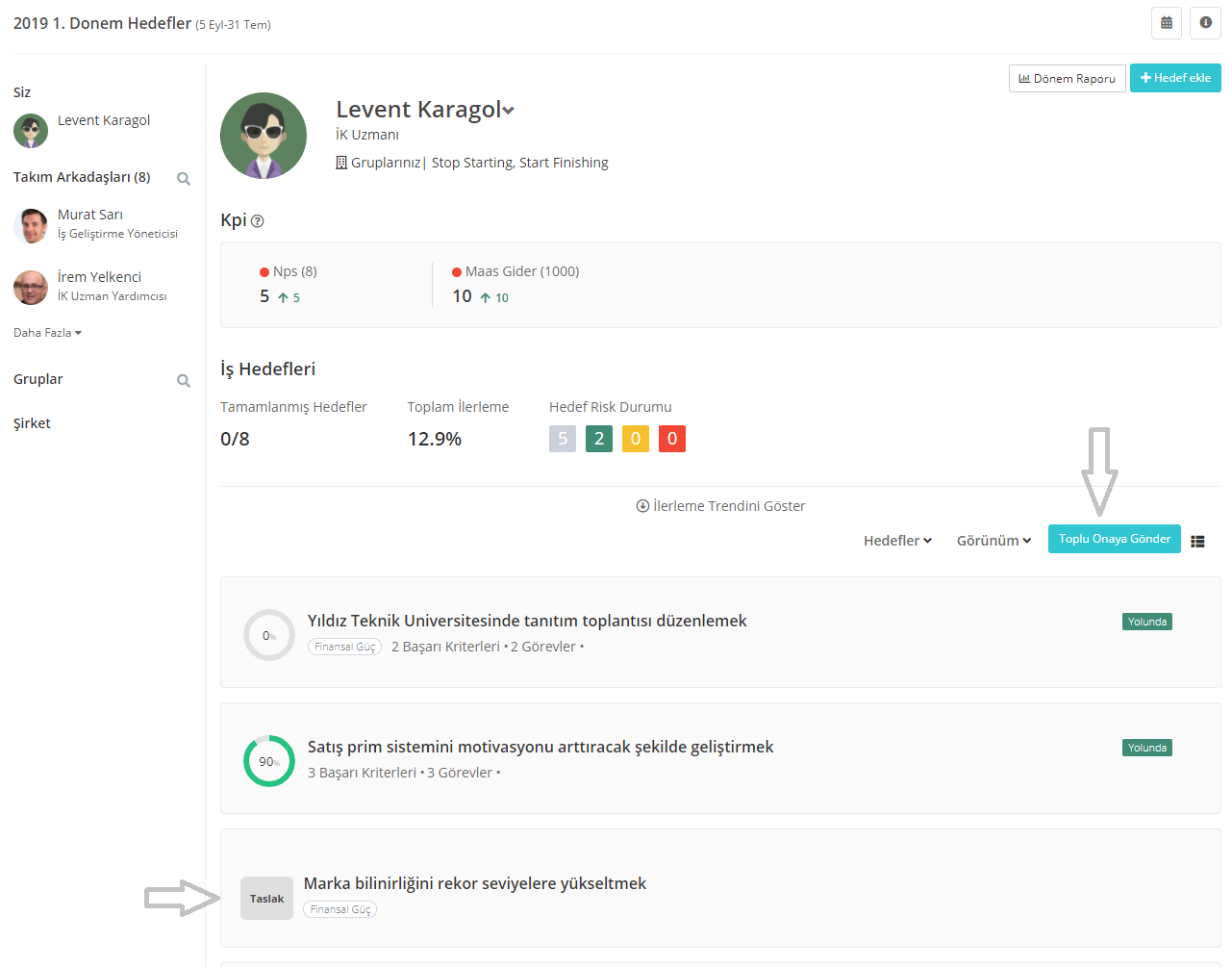 Hedeflerini taslak olarak oluşturduktan sonra iş hedeflerin sayfasında toplu onaya gönder butonuna basman yeterli olacaktır. Platform sadece taslak halinde olan hedefleri onaya gönderecek, onaylanmış hedefler yöneticinin onayına düşmeyecek.