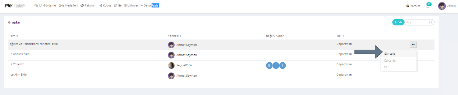 Gruplar butonuna tıkladığında bu pencere ile karşılaşacaksın. Düzenlemek istediğin grup satırının sonundaki 3 nokta butonuna tıklayarak “İsim”, “Yönetici”, “Tipi” ve “Üst Grup” bilgilerinde düzenlemeni gerçekleştirebilirsin.
