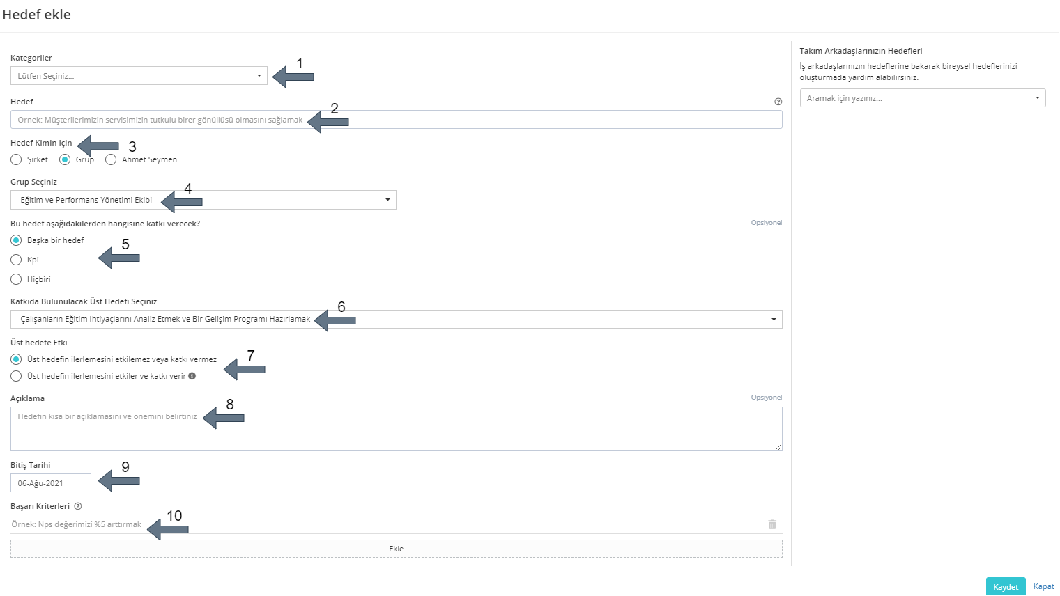 Belirlediğin hedeflerin başarı kriterlerini buradan oluşturabilirsin. Her bir hedef için en az 1 adet başarı kriteri girilmesi zorunludur.