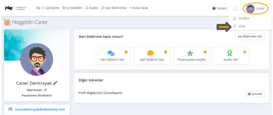 Kullanıcı hesabından çıkmak için aşağıdaki resimde, sağ üst köşedeki kullanıcı adının üzerine tıklayıp "Çıkış" a tıklayarak hesaptan çıkış yapabilirsiniz.