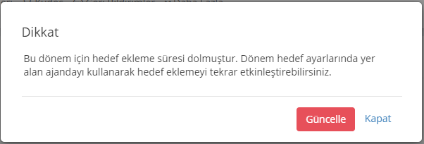 "Hedef Ekle" butonuna bastıktan sonra "Bu dönem için hedef ekleme süresi dolmuştur" hatası alıyor ve hedef eklemeyi tekrar aktif hale getirmek istiyorsan uyarı ekranında gelen güncelle butonuna basmalısın. (Not bu uyarı sadece admin kullanıcılara gösterilir)