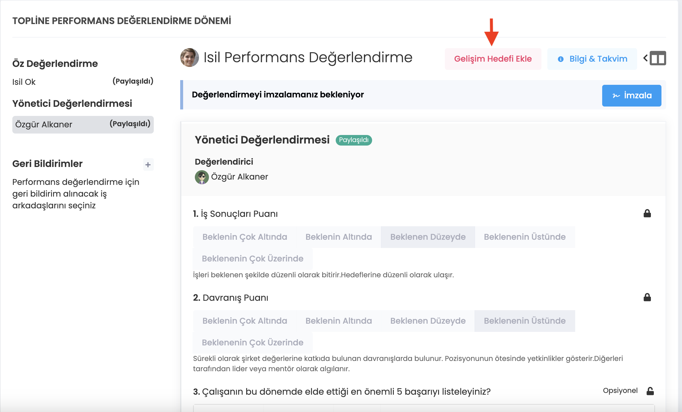 Yönetici değerlendirmesini paylaştığı takdirde aşağıdaki şekilde ekranı görecektir. Platform, yöneticiyi, sonraki adımda, değerlendirmeyi imzalaması yönünde bilgilendirmektedir. Yönetici, değerlendirdiği çalışan için "Gelişim Hedefi Ekle" butonuyla da gelişim hedefi ekleyebilir.