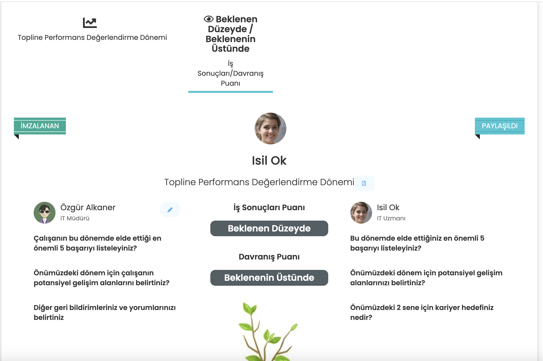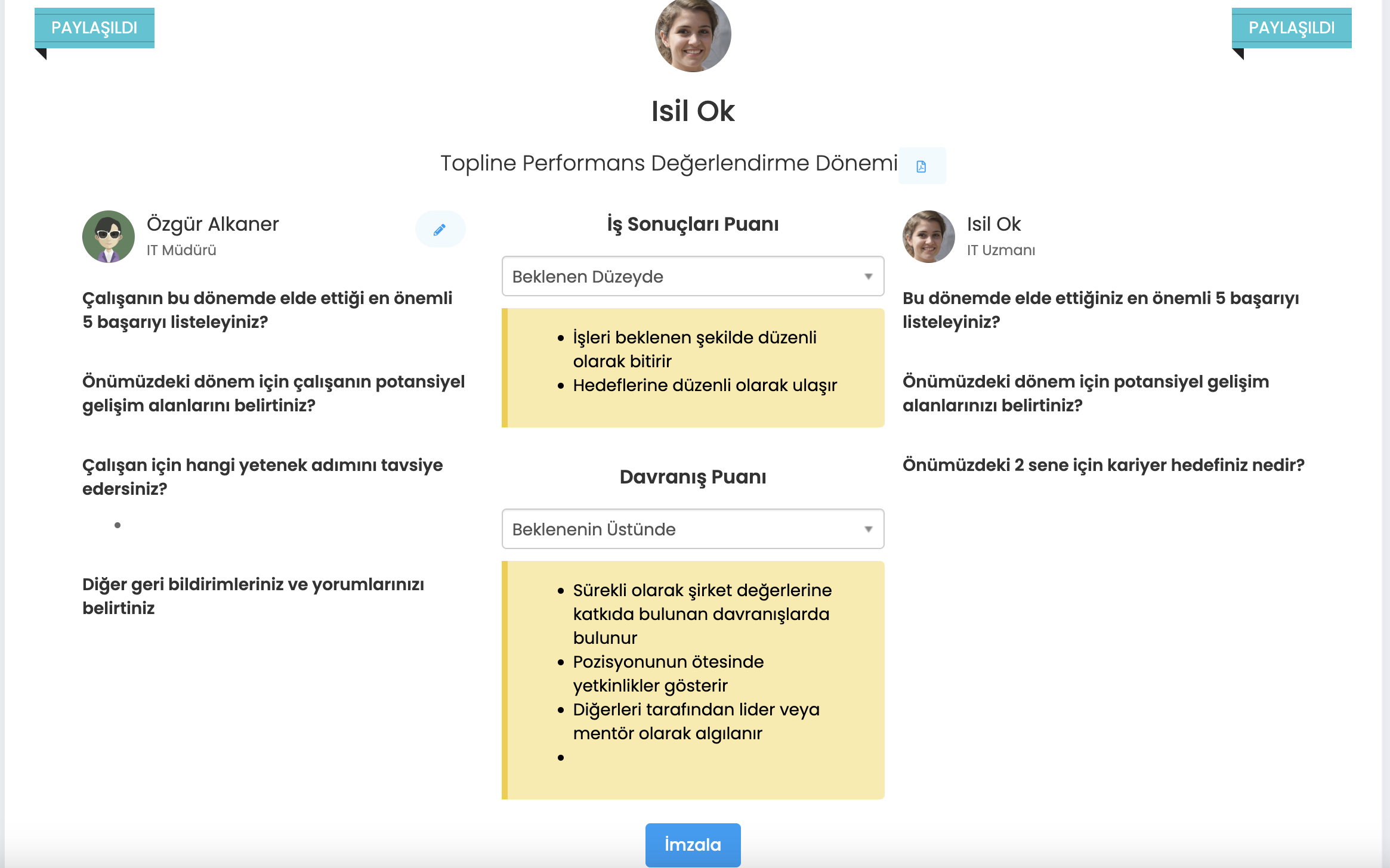 Yukarıda öz değerlendirmesini yöneticisi ile paylaşan çalışanın formunu görmektesin. Platform çalışanı, sonraki adımda, değerlendirmeyi hemen imzalayabileceği ya da imzalamak için yöneticinin değerlendirmesini paylaşmasını bekleyebileceği yönünde bilgilendirmektedir.