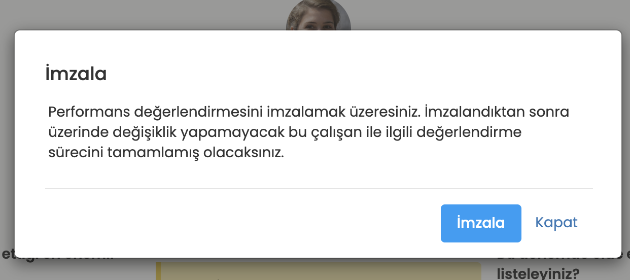 - Kalibrasyon sonrası ise imza sürecine geçilir. Puanlama kullanıldığı durumda yönetici kalibre edilmiş puanı imza formunda girerek çalışan ile paylaşır. İmza ile paylaşılan değerlendirme puanı çalışan tarafından artık nihai puan olarak görüntülenir.