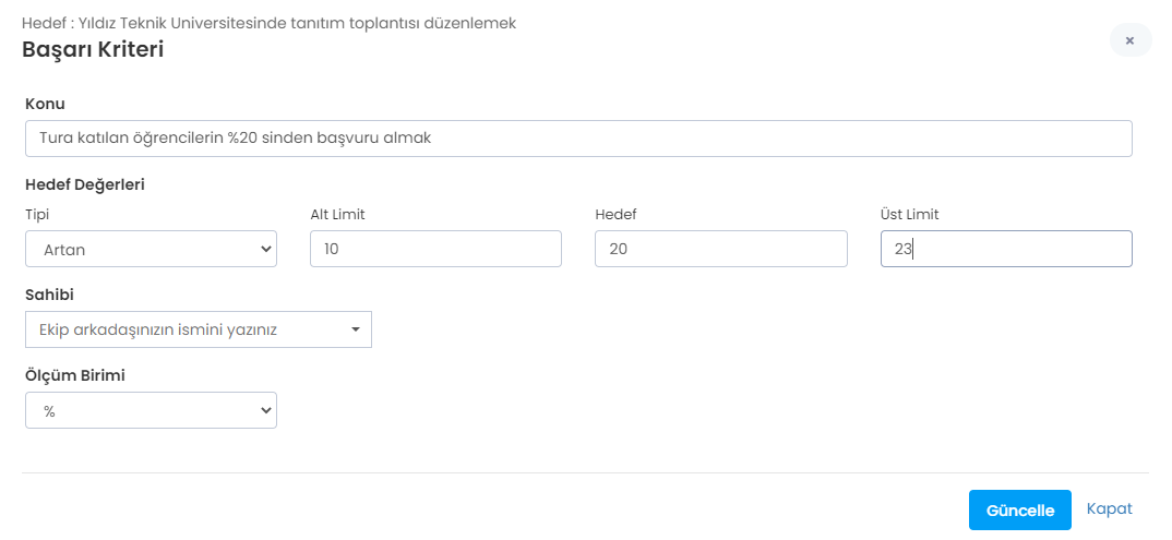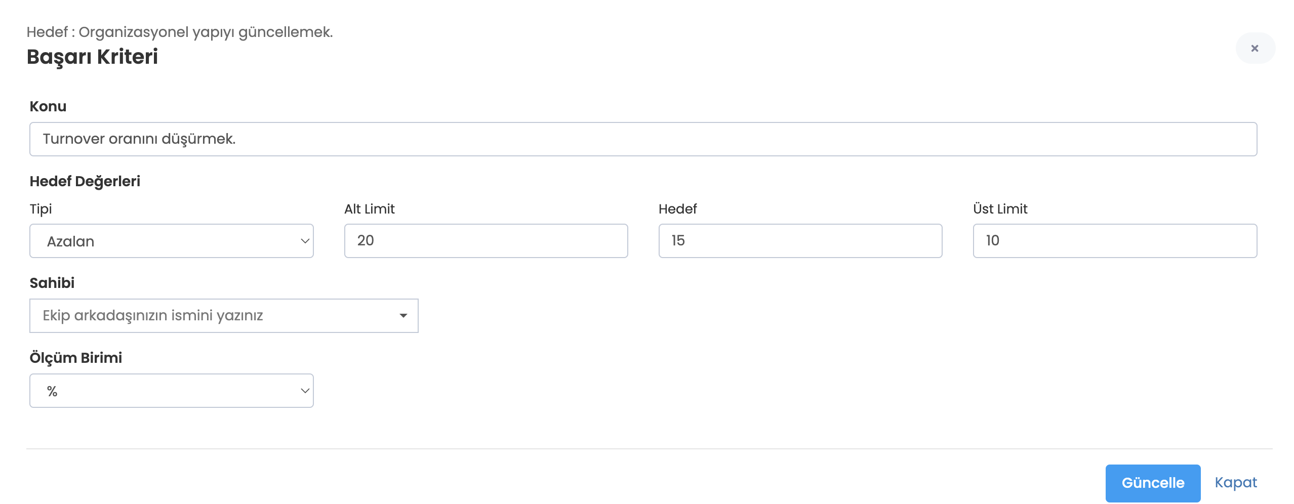 Aşağıdaki ekran görüntüsünde örnek bir başarı kriteri ve hedef değerlerini görmektesin.