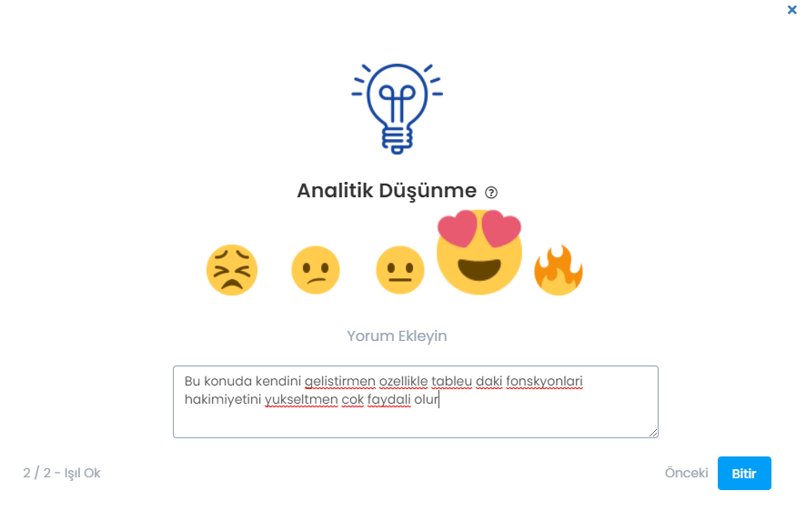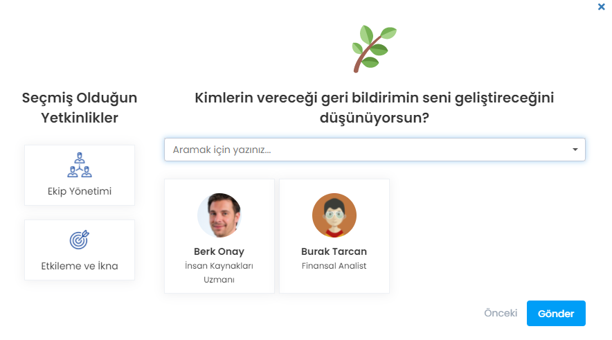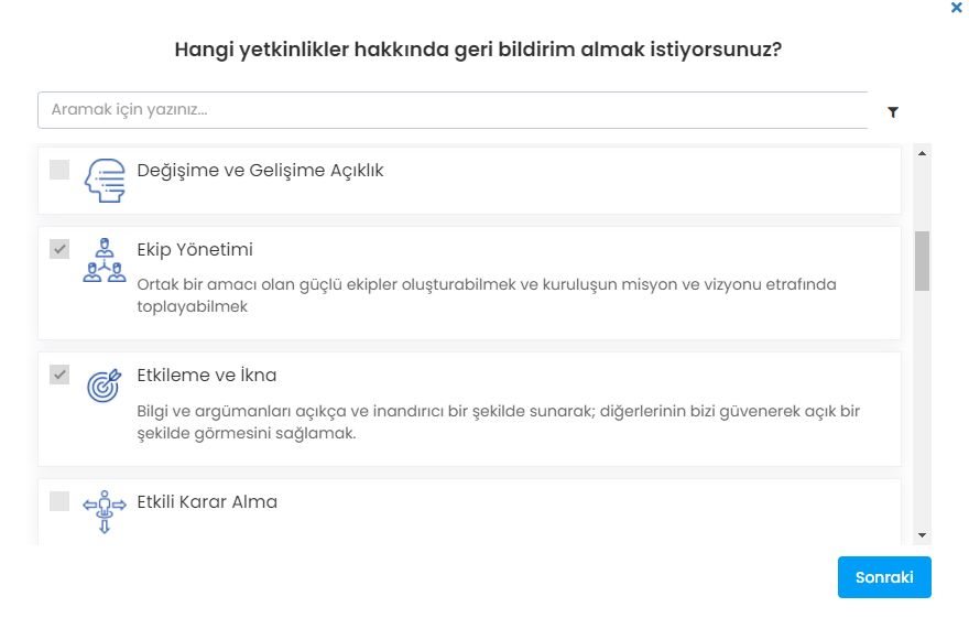 - Kullanıcı geri bildirim almak istediği yetkinliklerden seçer.