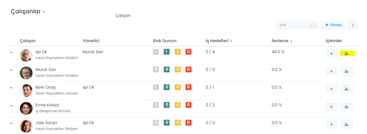 Çalışanların listelendiğini tabloyu göreceksin. İzin vermek istediğin kullanıcıyı bul ve işlemler sütunundaki aşağıda sarı ile işaretlenmiş butona bas.