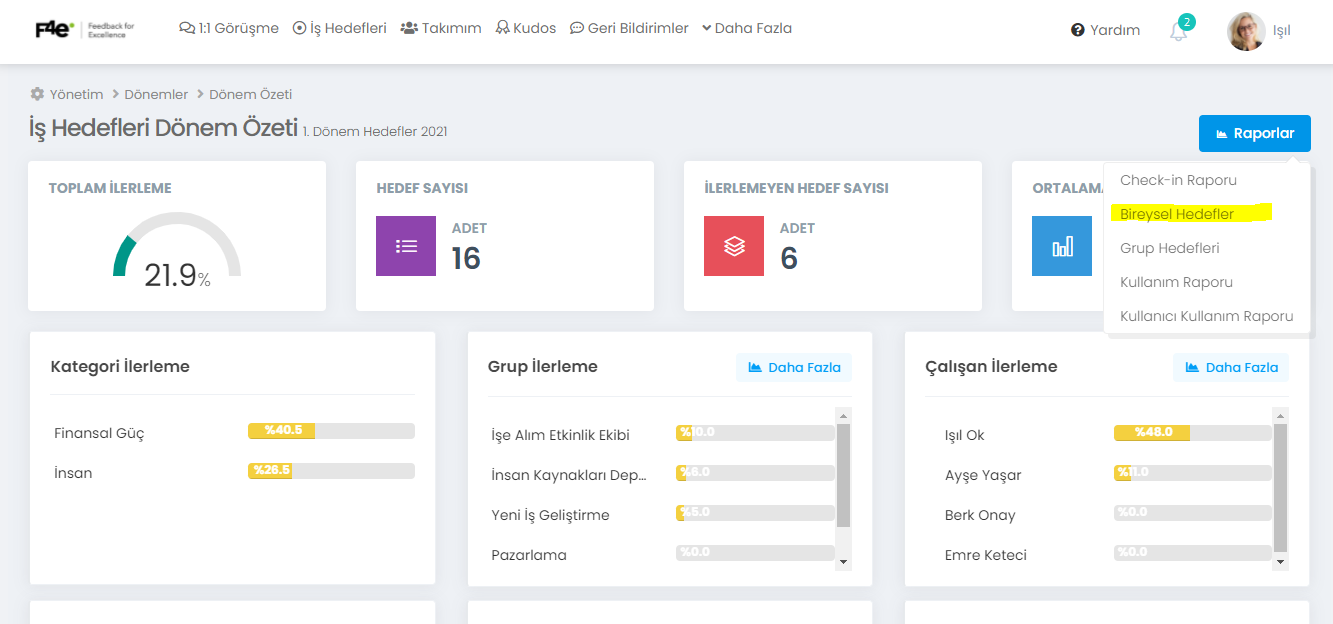 Daha Fazla > Yönetim > Dönem Yönetimi > Raporlar (Döneme ait rapor linkini tıkla) > Bireysel Hedefler