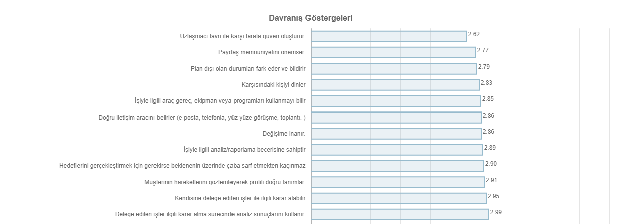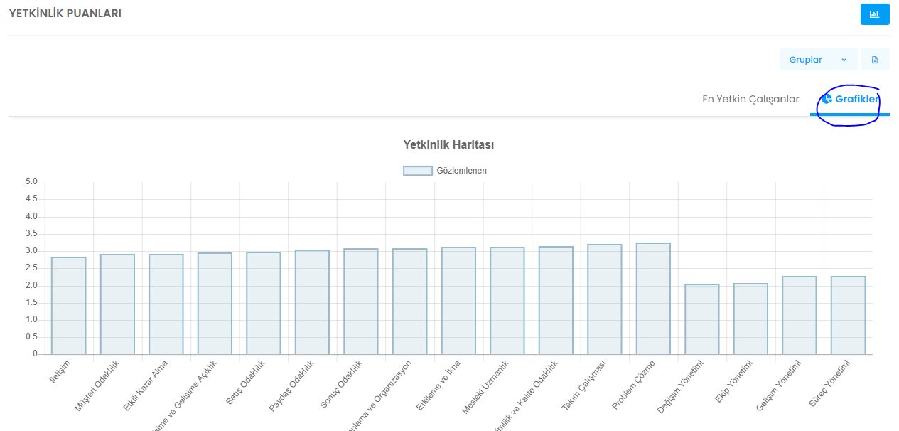 Grafikler sekmesinin altında yetkinlik ve davranış göstergelerinin puanlarını ortalamaları ile göreceksin. Karsına ilk çıkan grafik ortalamaları dönem bazlı gösterirken , grup bazında filtreleyerek grup içerisindeki ortalamayı görebilirsin.