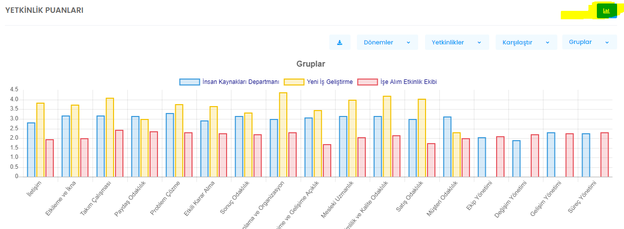 Yetkinlik puanlarını grup bazında karşılaştırmak istiyorsan yetkinlik dönem raporuna gitmelisin.