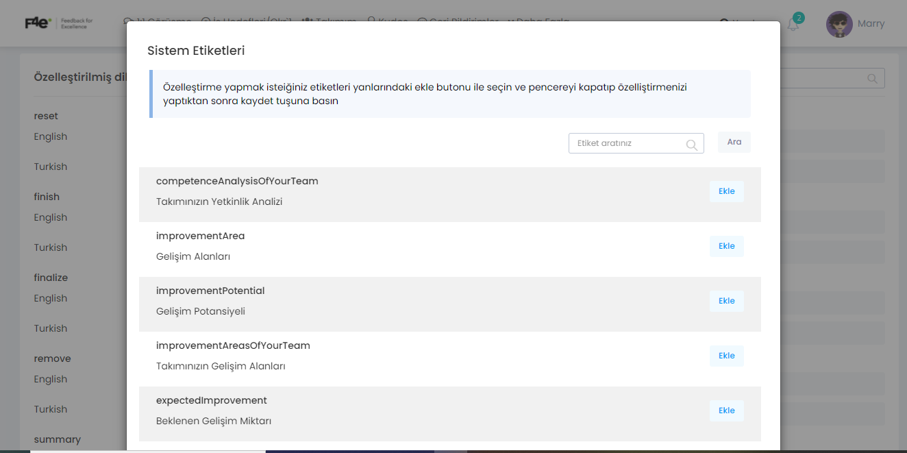 Özelleştirmek için seçtiğin etiketler sayfada listelenecek. Gerekli dil düzenlemelerini yap ve sayfanın en aşağısında yer alan Kaydet tuşuna bas. Hesabından çık ve tekrar giriş yap. Özelleştirdiğin etiketlerin hesabında aktif olduğundan emin ol.