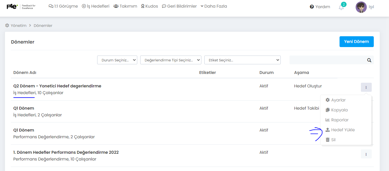 Üst Menü > Dönem Yönetimi > İlgili Dönem Butonu > Hedef yükle linkine tıklamalısınız.