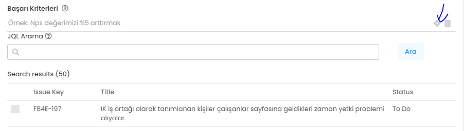 Artık Jira ile hesabin entegre oldu. Hedef ekle ekranında yer alan basari kriterleri satırında yer alan aşağıda işaretli Jira ikonunu tıkla ve ara butonuna bas. İlişkilendirmek istediğin issue lari seç.
