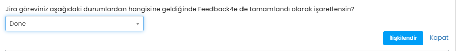 Issue'nin hangi jira durumunda Feedback4e'de tamamlandı olarak işaretlediğini belirle ve ilişkilendir tuşuna bas.