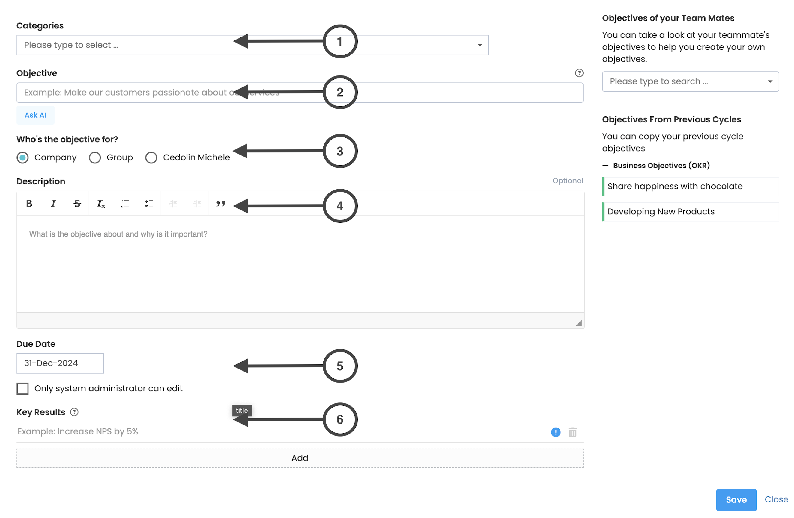 Company objectives are created only by admin users, and their updates and check-ins are made by admin users.