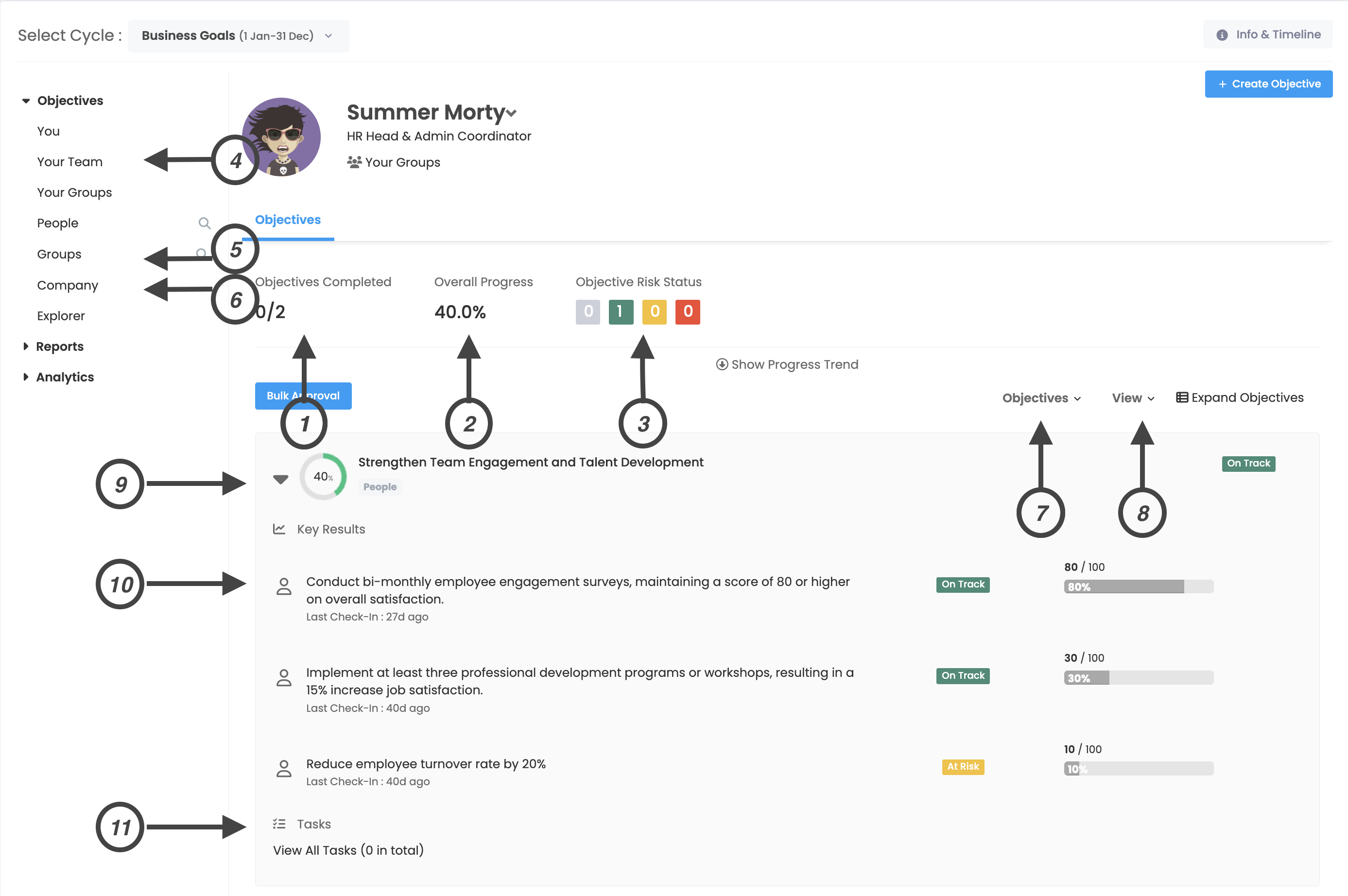 To see group, individual and company objectives for the cycle and navigate between objectives