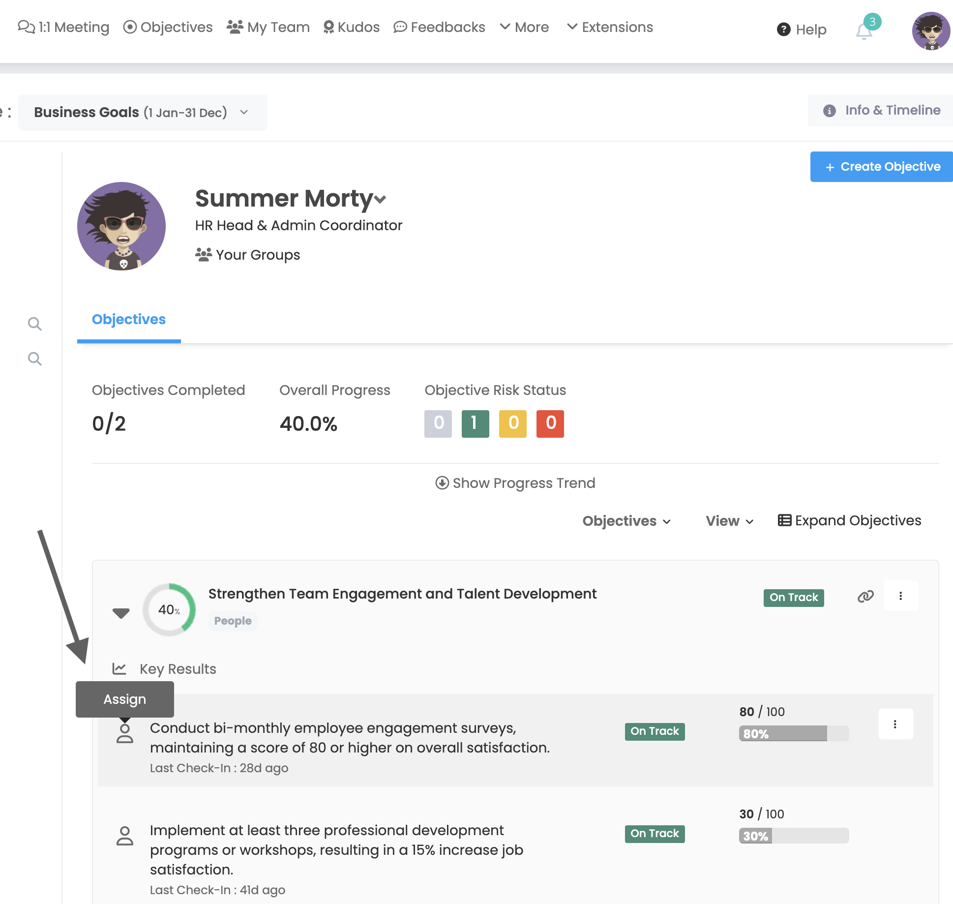 You can assign responsibilities while creating key result, or you can assign responsibilities after creating them. To do this, you first need to click on the objectives window.
