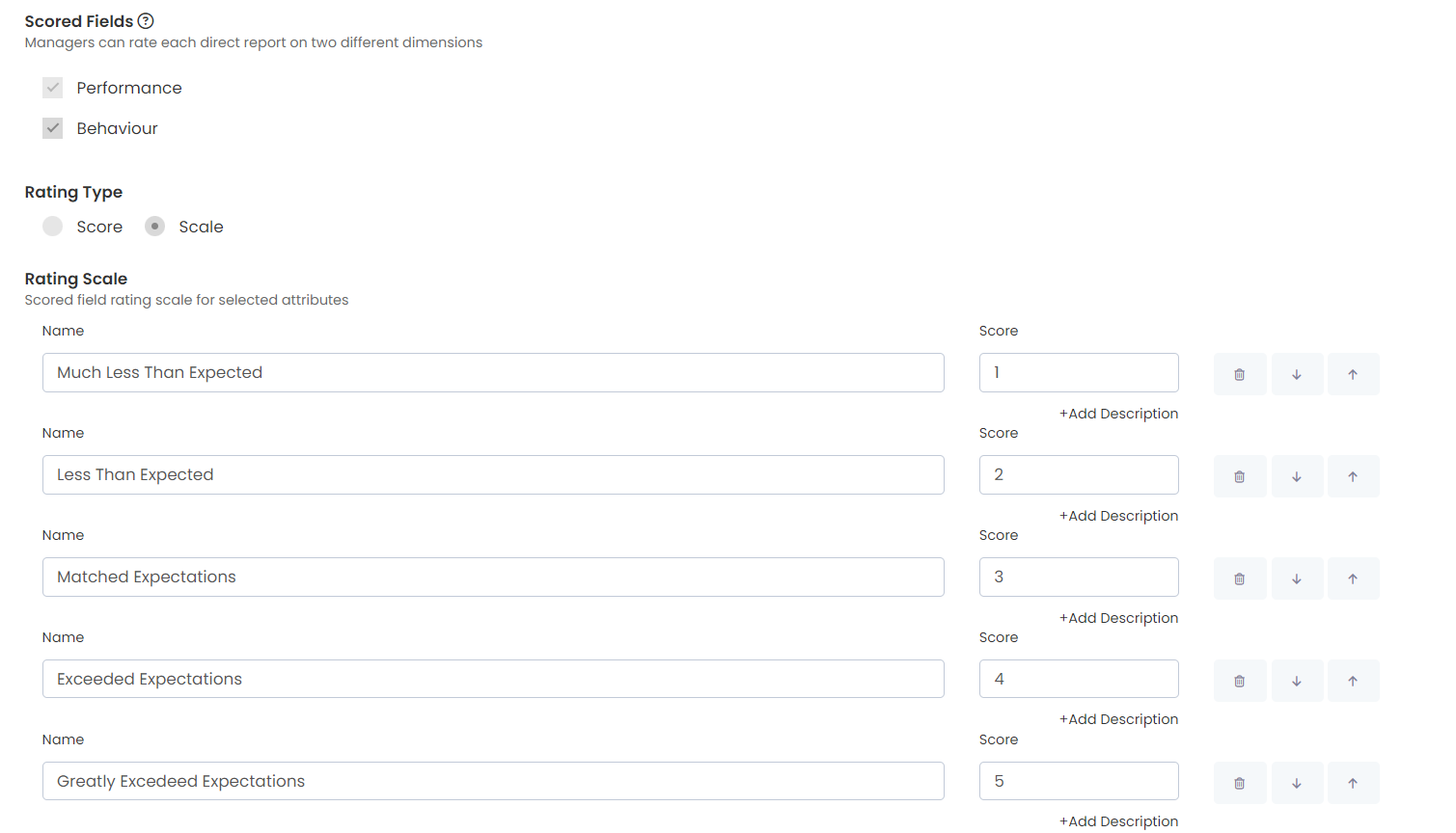 The defined score scale is valid for both dimensions. You can change the definitions on the scale as you wish. The score section in the definition is not shown to employees. Employees make scores using the scale name and see the results. Points are tracked by administrators and system administrators