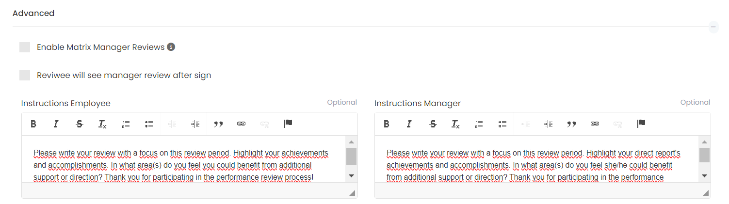 In this tab, you can define instructions for the employee and the manager, and have them evaluated by the employee's second manager or matrix manager. There are two different forms for employees who are Matrix managers. The employee enters the performance evaluation process separately with the matrix manager and the first manager.