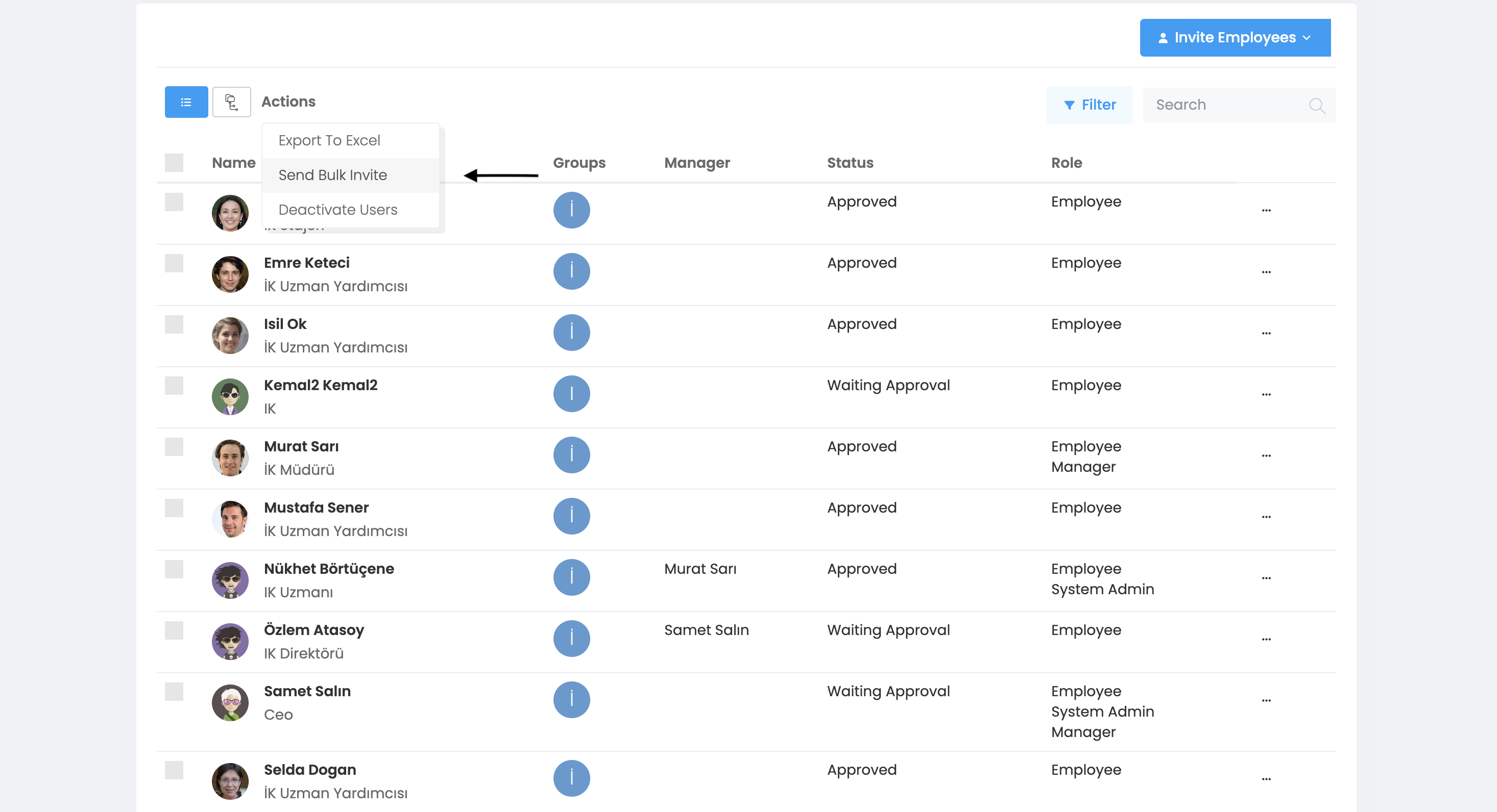 You can also send individual invitations to these people who have the "Awaiting Approval" status. You can perform this operation by clicking on the "Send Invitation" option when you click on the three dots button to the right of the employee line.