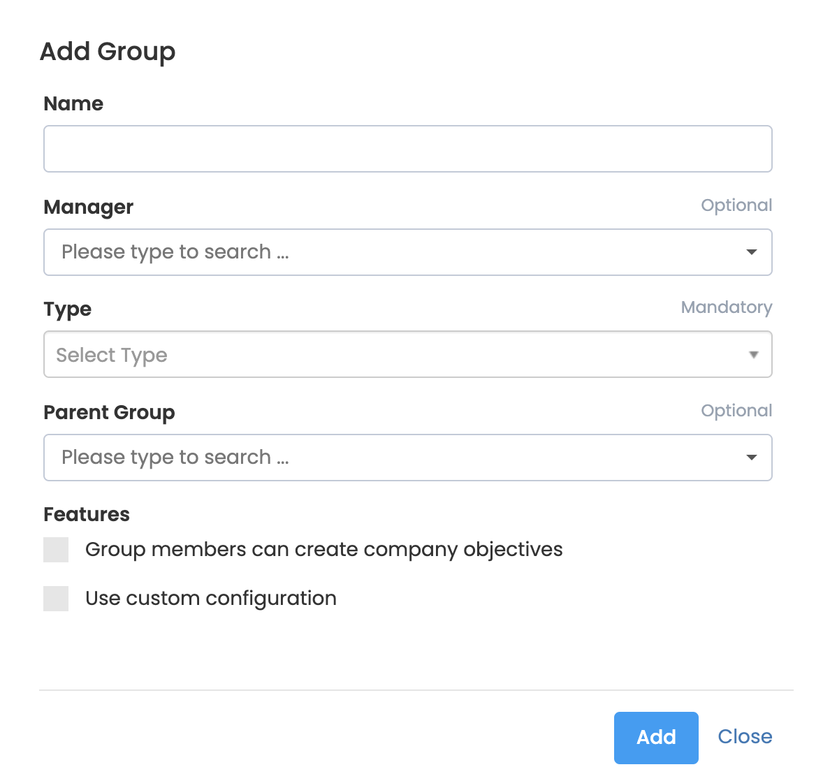 - Type: You need to choose whether the group is a team, a department, or another division within the organizational structure. You can add it by typing a new type into the Type option. For example, if your institution has an "agile" organizational structure, you need to create groups of the "squad" type and assign employees to this group. Similarly, if you have project groups and you want to create and track goals on them, you need to create project groups in a horizontal hierarchy.