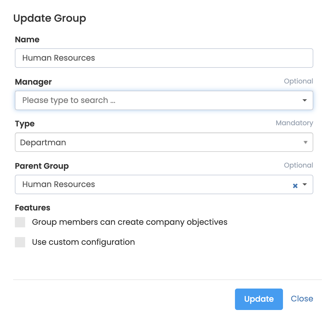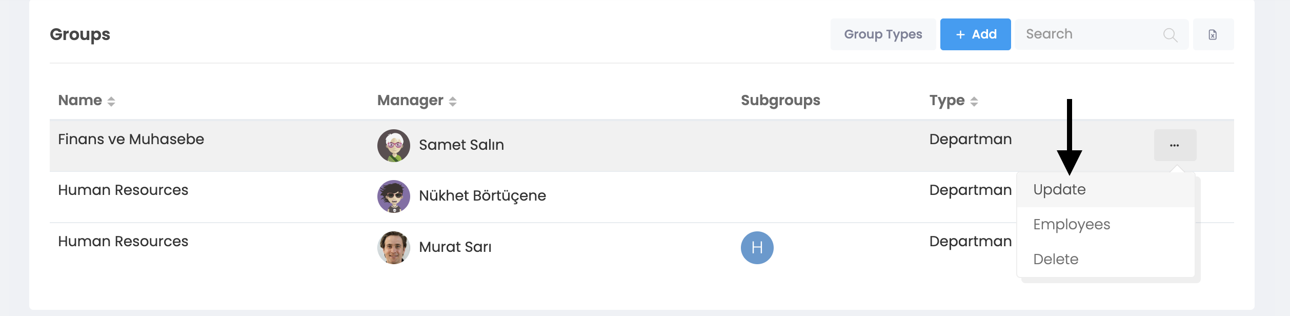 When you click on the Groups button, you will see this window. When you click on the 3-dot button at the end of the user line you want to make a "Group Administrator" and click on the "Update" tab, you will come to the "Update Group" screen below.