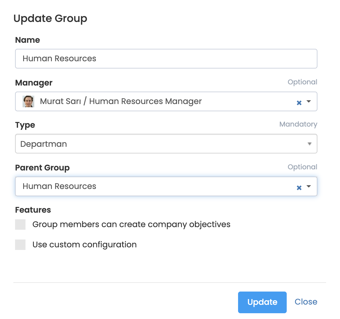 If there is a predefined group administrator under the administrator section, you will see the following screen. In this example, you can delete the user "Murat Sarı / Human Resources" by pressing "x" and continue the process by entering the name of the new user.