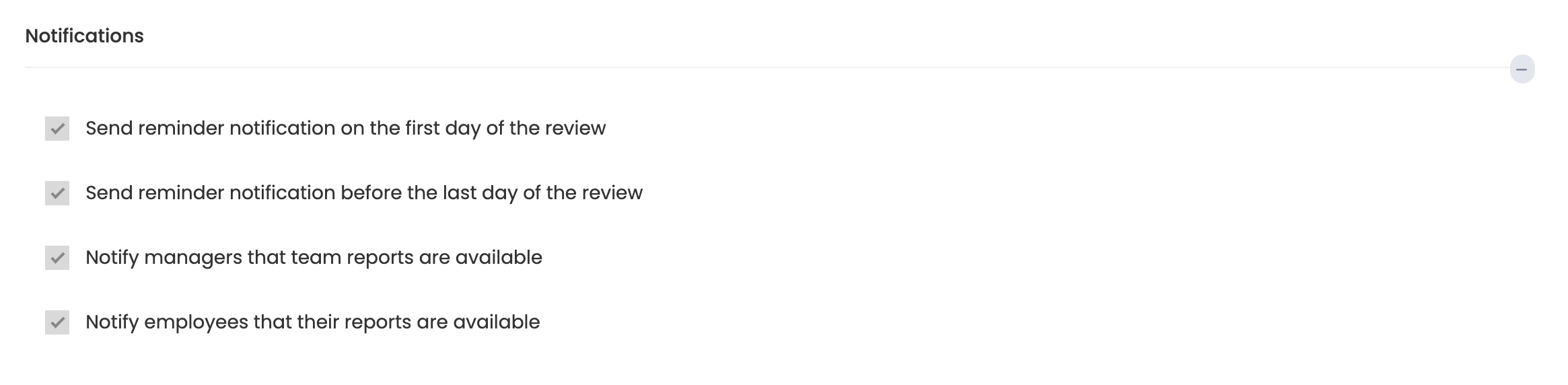Open the notifications section on the 360 competency feedback period setting page on the next page and make the necessary adjustments.