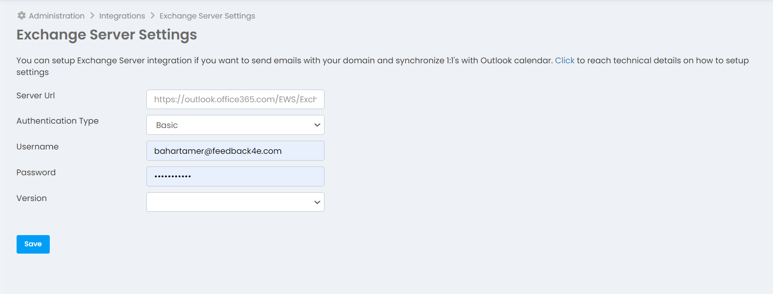 Basic: Username (e-mail) and password will be the user information you created on the Exchange server. After making the settings, click the link above (EWS API URL) in the browser. The page you will access will ask for your username and password. You should be able to log in to that page without any errors with the username and password you created. If you cannot log in, the integration service may not be activated on the Outlook365 side or the user may not be authorized. Contact your IT department again.