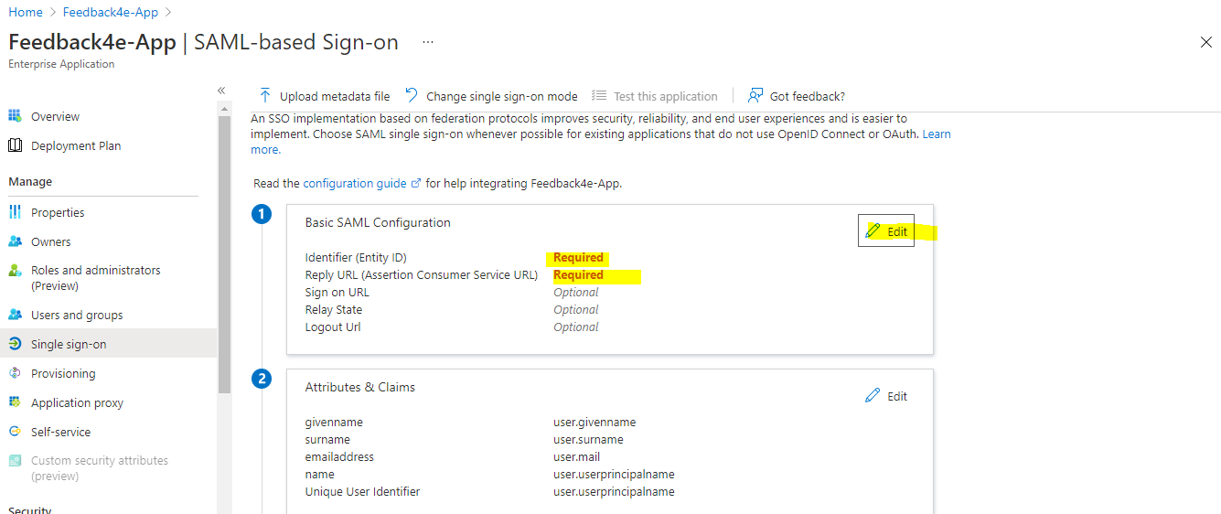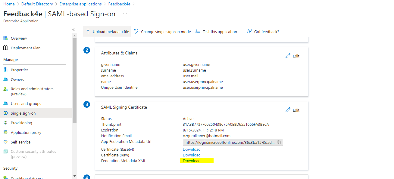 Start the SAML file download process, which is the 3rd step, by clicking the download button next to "Federation Metadata XML". Upload the SAML file you will download to the Feedback4e SSO area using drag and drop