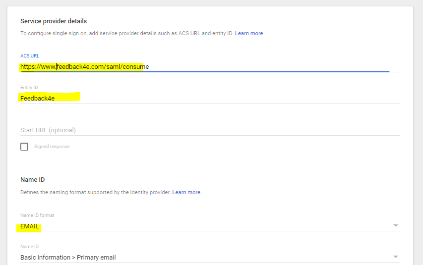 Saml Consume Service : https://www.feedback4e.com/saml/consume