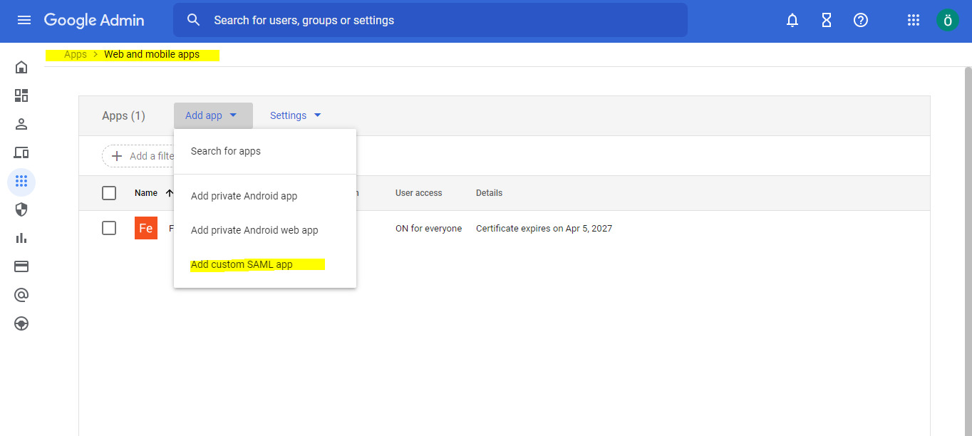 Go to Apps > Web and Mobile Apps page. On this page you need to create a new Custom Saml App.