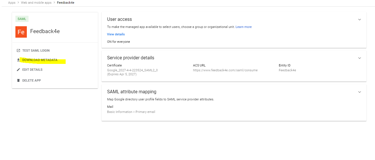 Now that users have activated the app, everything is almost OK. Download your saml file by clicking the "Download Metadata" link on the application page.