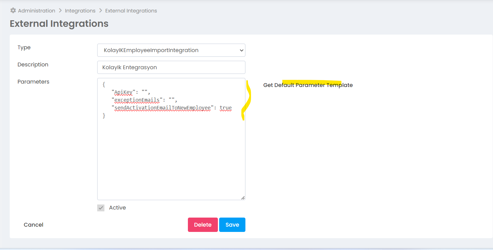 exceptionEmails Define the email addresses of the users you do not want to import from KolayIk in the parameter, separated by commas. (Optional)