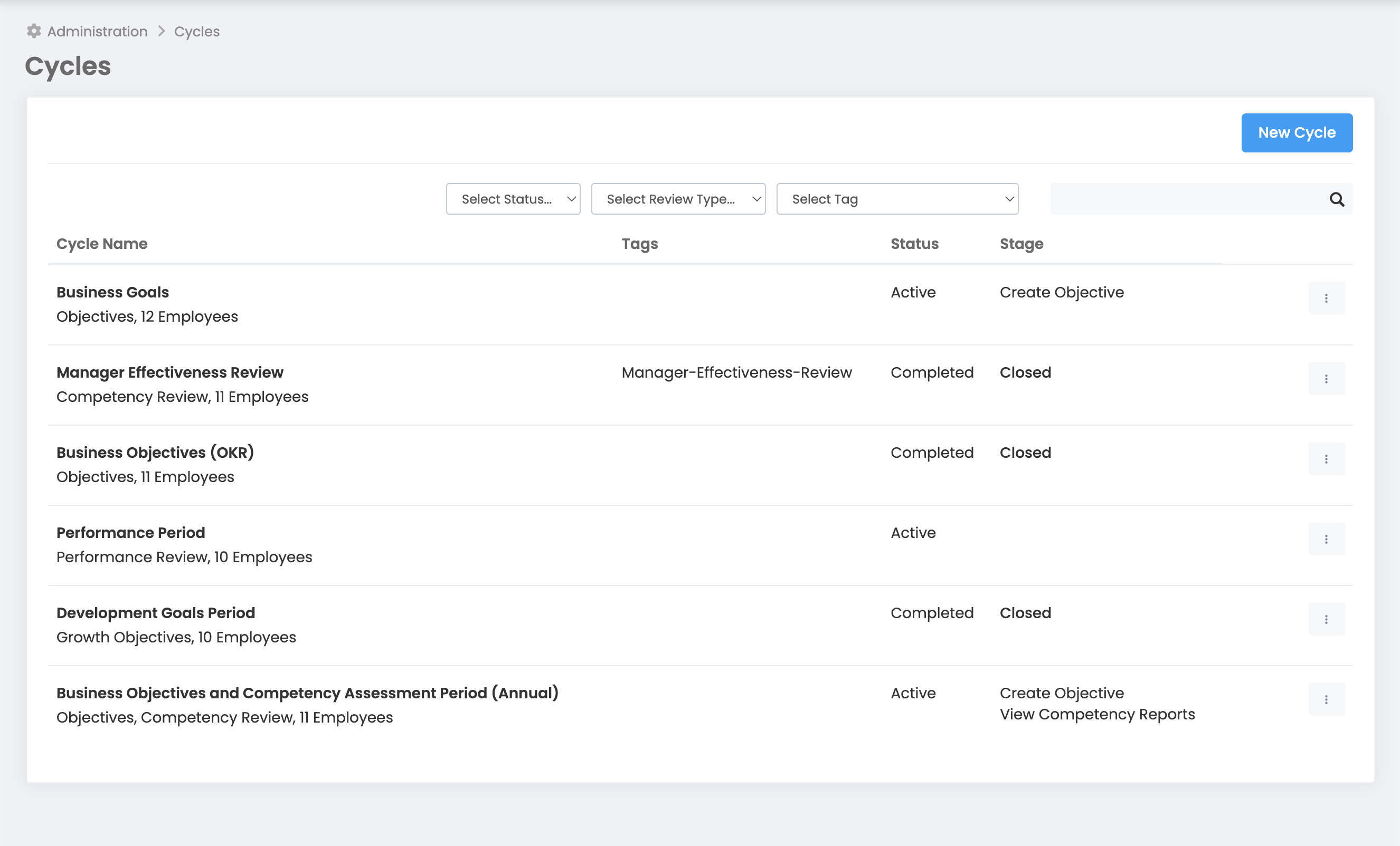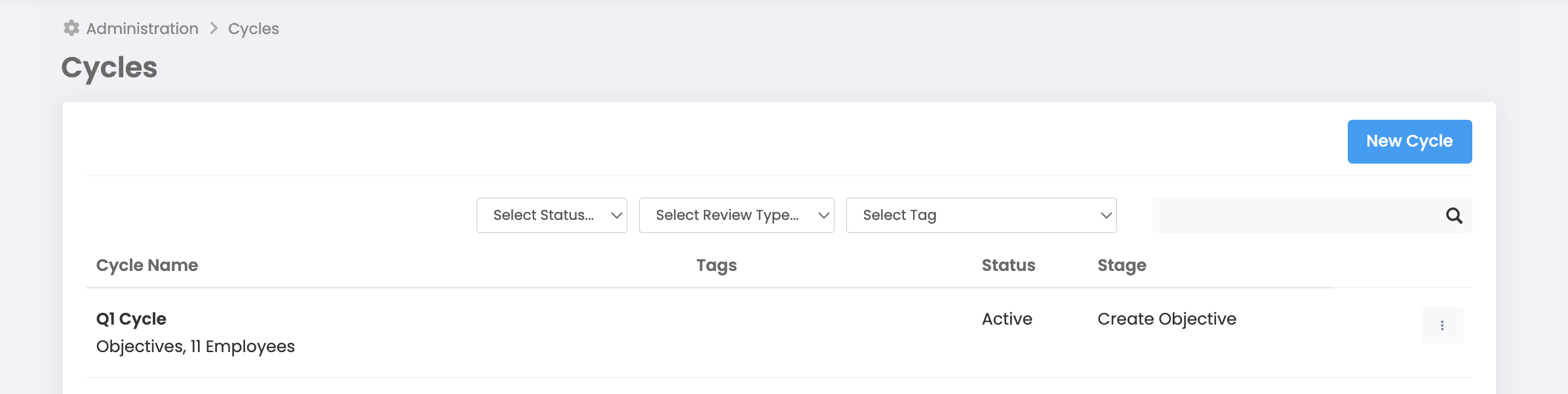 When you click on the Cycle Management button, you will see the window above. To create a new cycle, click on the "New Cycle" button in the upper right corner of the page and you will come to the "Create Cycle" screen below.