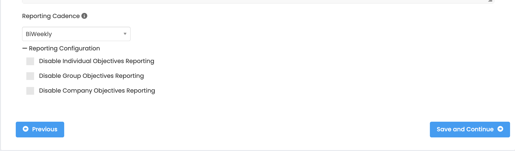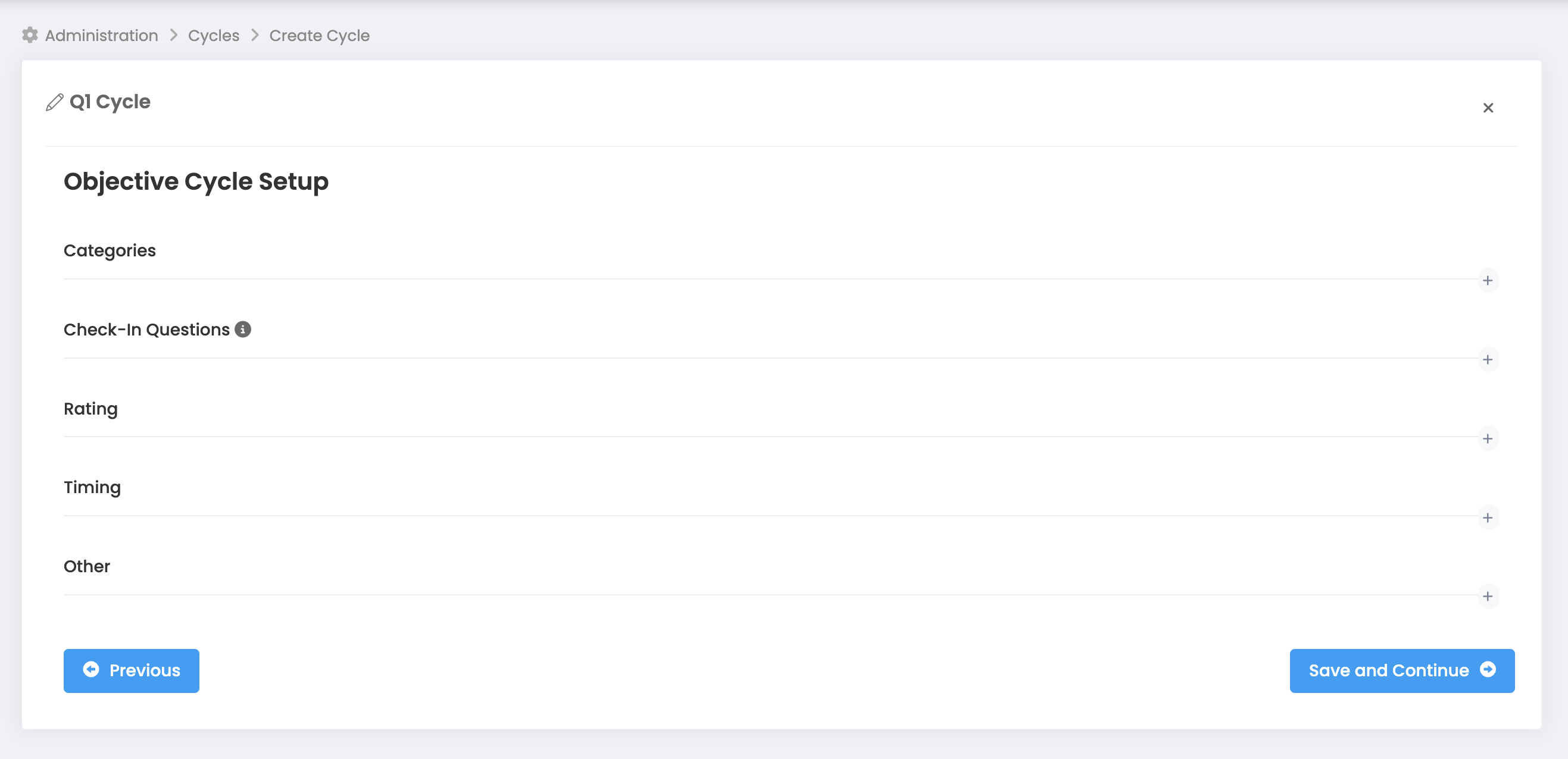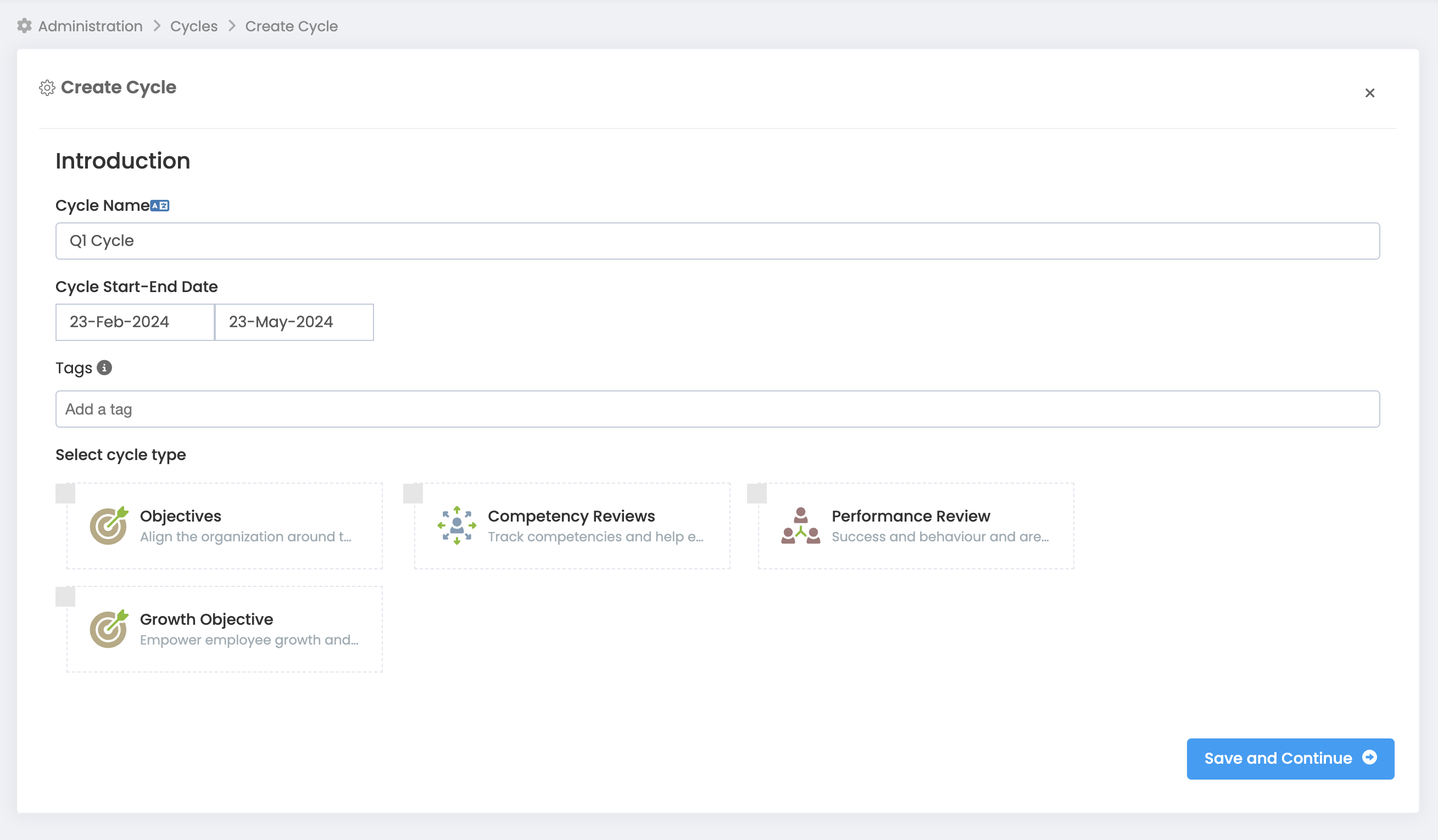 After entering the "Cycle Name" and "Cycle Start-End Date" information for the cycle you want to create, you can add a "label" if you wish, then specify the cycle type as "Objectives" and click the "Save and Continue" button to open the "Objective Cycle Setup" screen below.