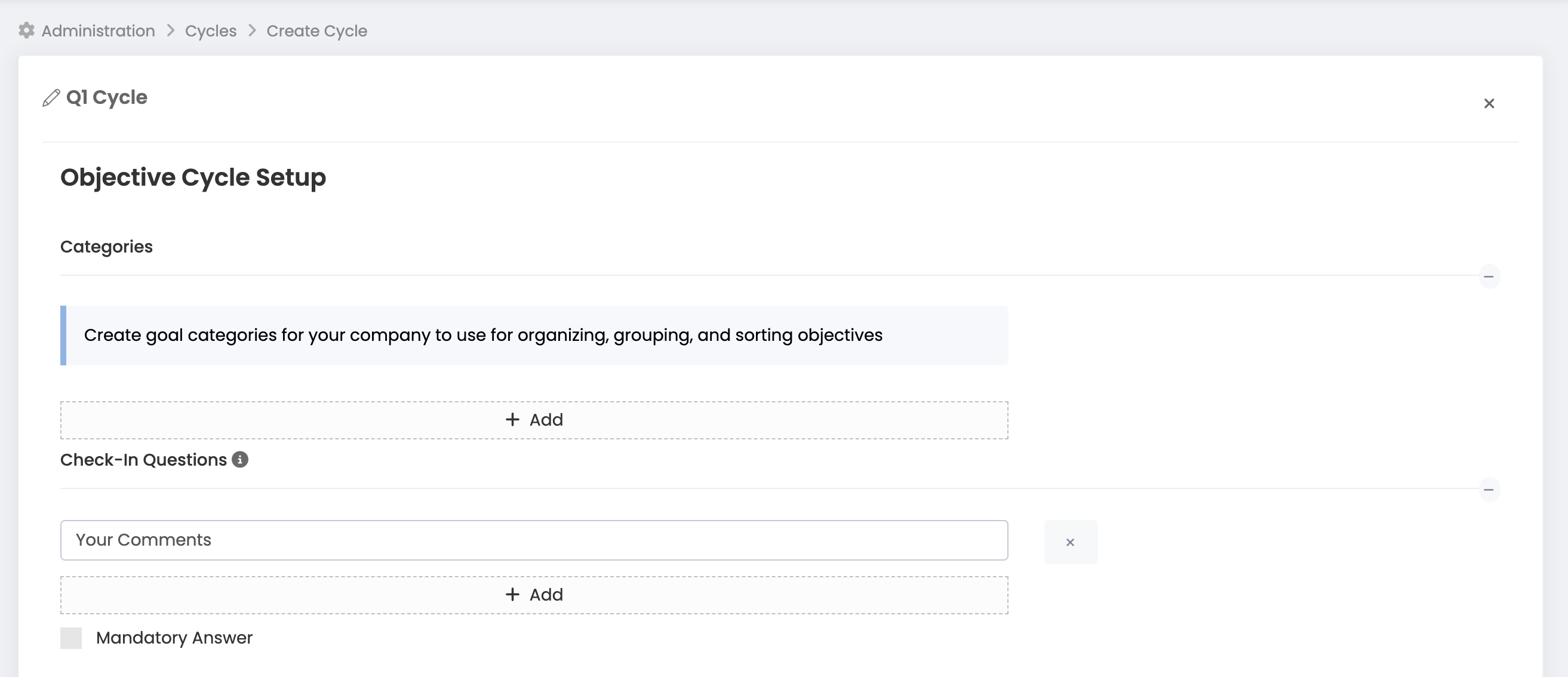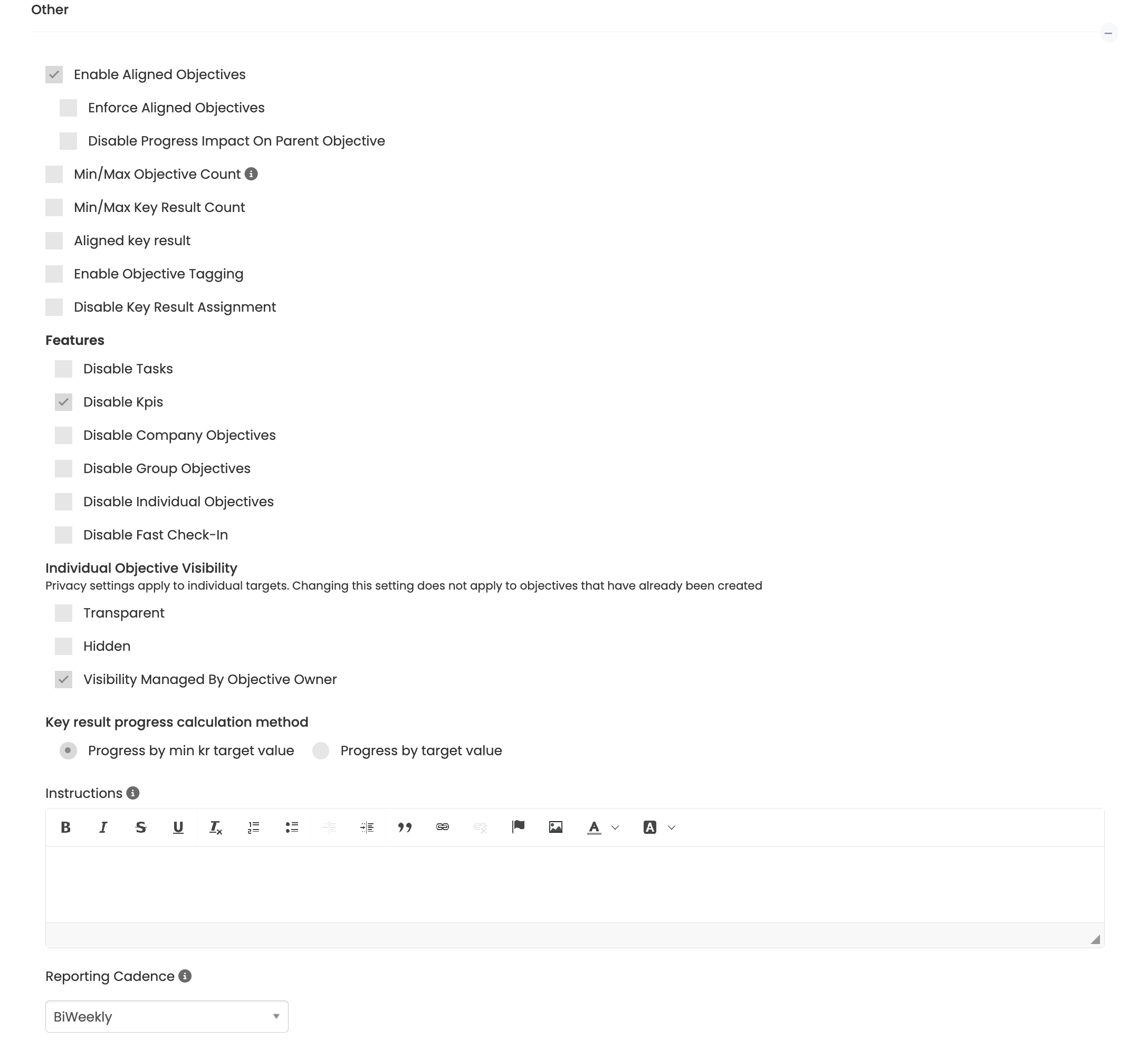 Categories: This option is a tool to try to provide structure to goals by aligning them around common themes or company priorities. For example, you can define strategic priorities in this area and enable employees to define which priority their goals are related to when creating goals. You can report how many objectives have been entered and progress percentages for these strategic priorities.