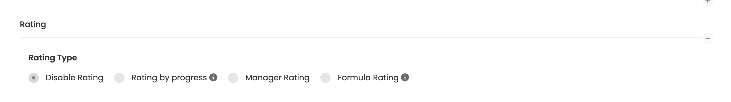 Rating: You can proceed by selecting the scoring type from the options "Disable Rating, Rating by progress, Manager Rating, Formula Rating". You can get more detailed information about rating by clicking this link.