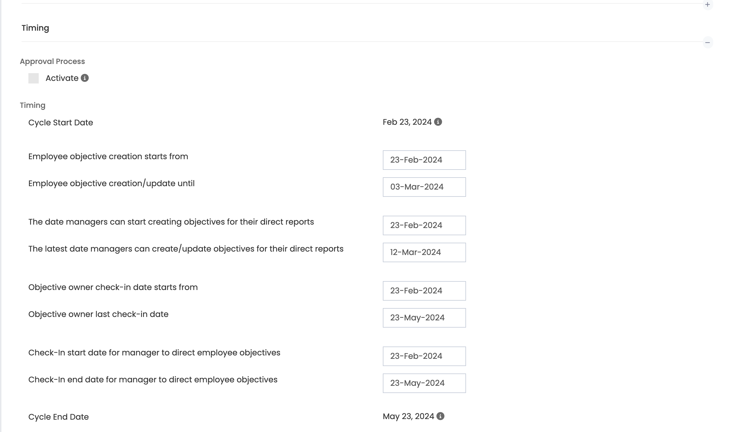 You can determine the cycle start/end date, objective creation/add/remove/change dates.