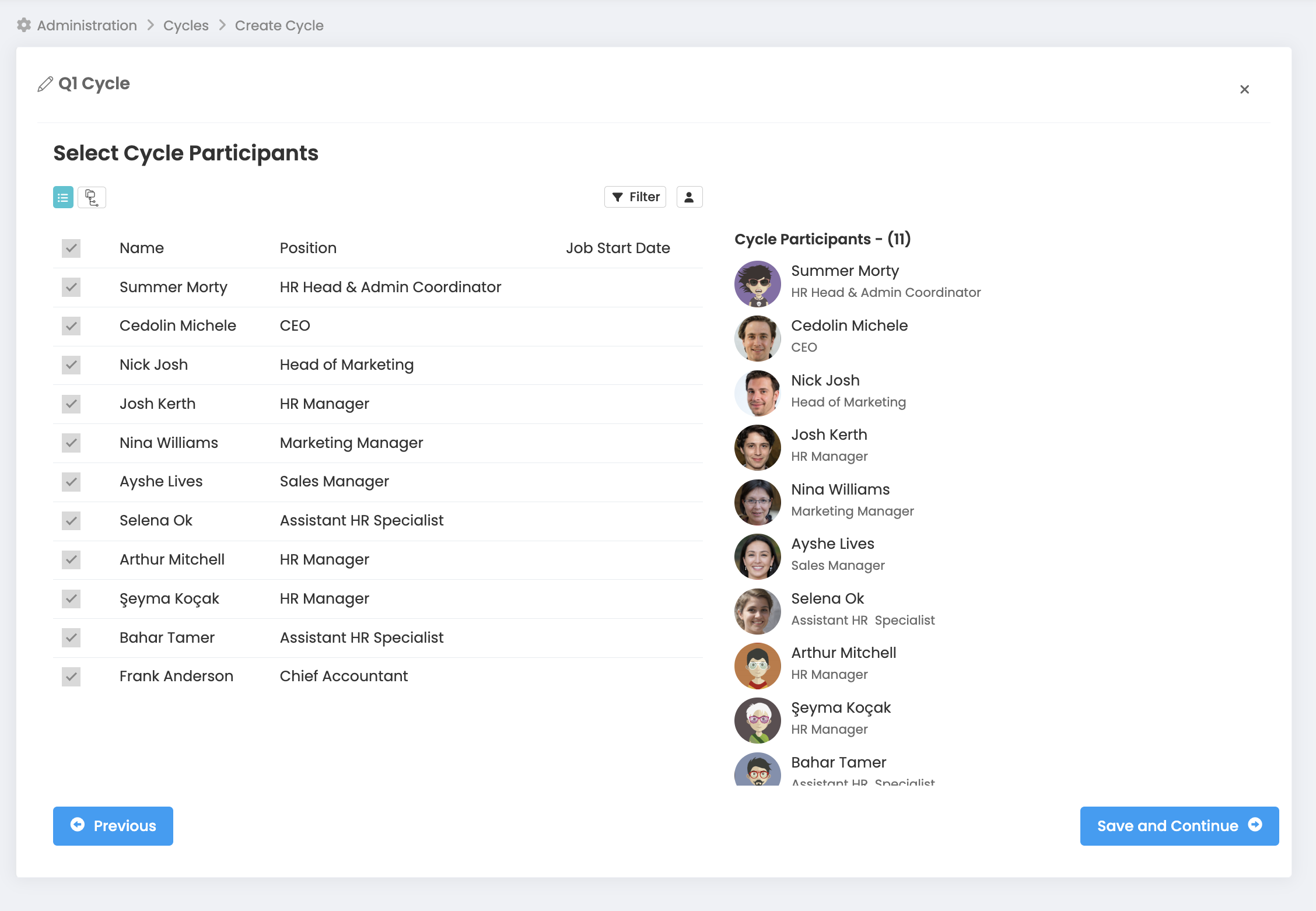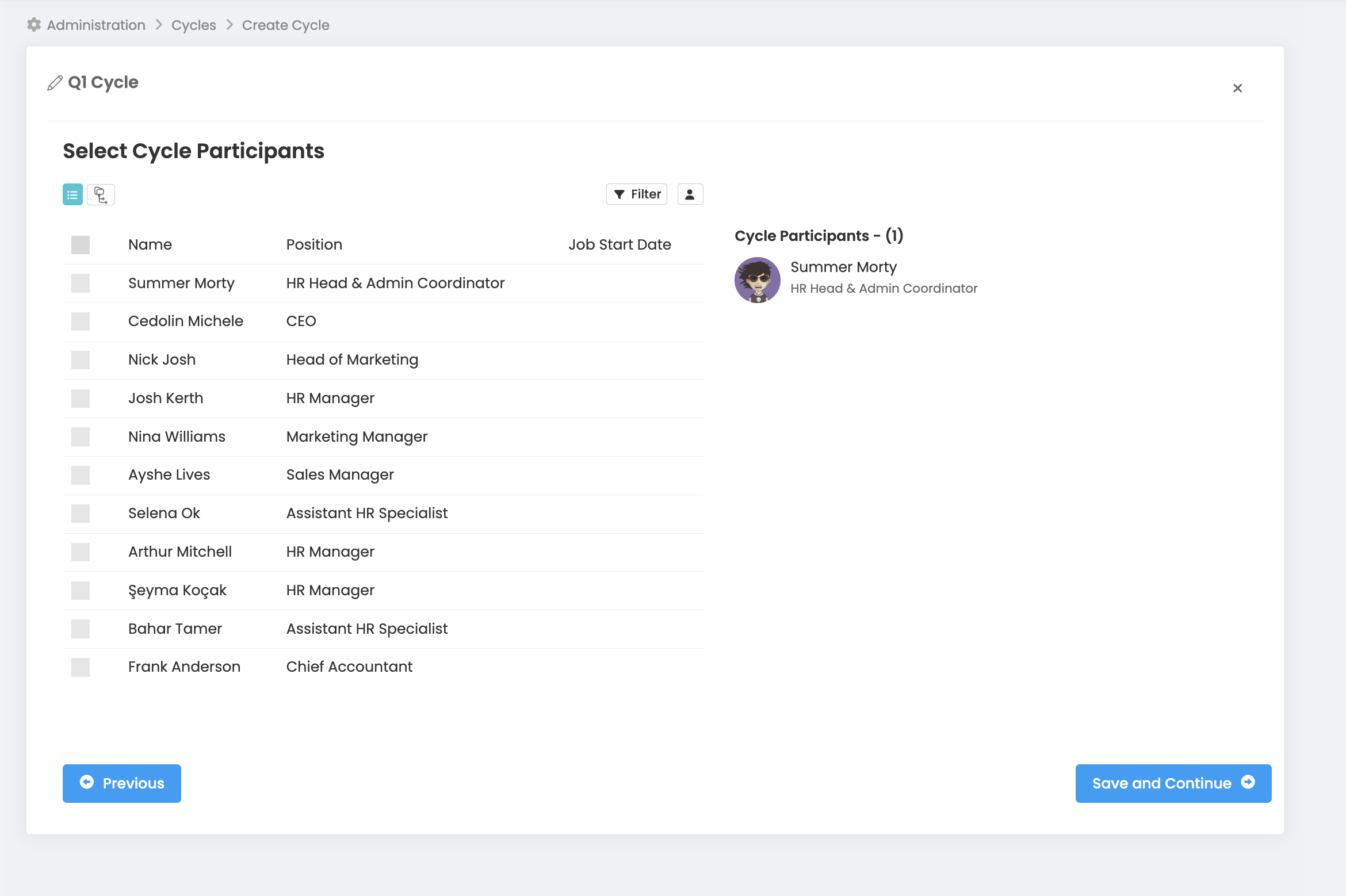 You can select participants by clicking on the boxes next to them. You will see the cycle participants you selected on the left side of the page. Afterwards, just click the "Save and Continue" button.