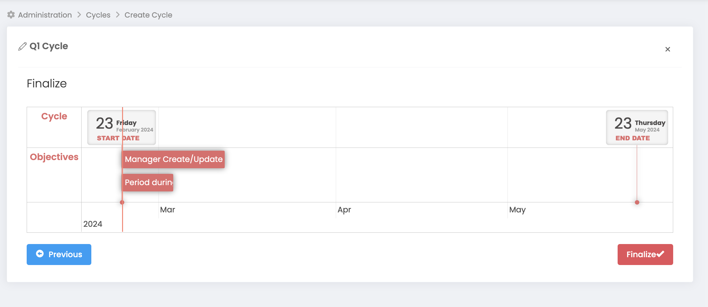 You can check the dates for the cycle you have selected on the screen below and change them by pressing the "Previous" button if you want to change them. If they are correct, you can continue by clicking the "Finalize" button.