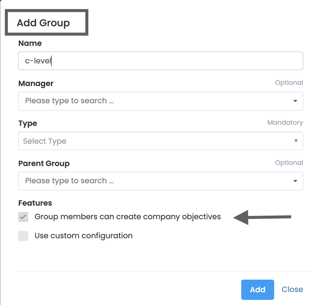 In some cases, you may want a group of employees other than the system admin, such as c-level managers, to be able to create and update company objectives and check-in to company objectives. To do this, you must first create a group for these employees and assign these employees to the group.