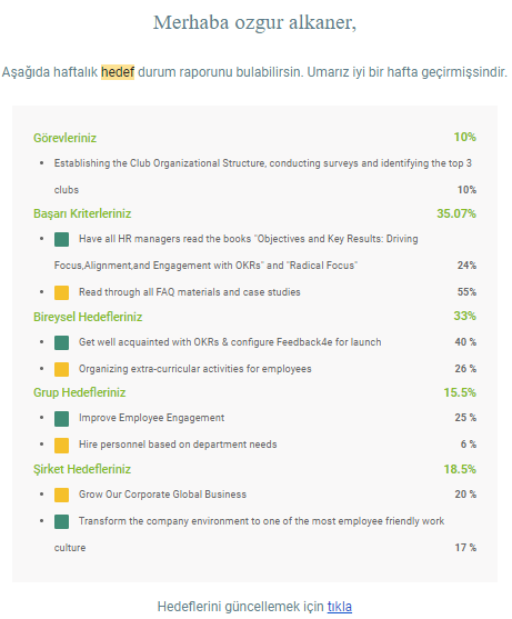 It is an e-mail message showing the progress and risk status of the employee's duties, individual success criteria, goals, group goals and company goals.